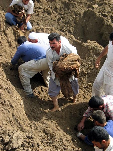 Civiles locales recuperan restos humanos hallados en una fosa común cerca de Hila. © 2003 Peter Bouckaert/Human Rights REGRESAR