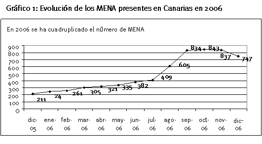 Fuente: Boletín Oficial del Parlamento de Canarias, nº 125, de 28 de marzo de 2007, p. 25. Estas cifras pueden no incluir a los menores que se han escapado de los centros de acogida pero que, sin embargo, siguen legalmente bajo la tutela de las autoridades de protección españolas. En enero de 2007, la Dirección General del Menor señaló ante Human Rights Watch que había unos 100 niños huidos.33