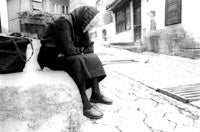 Elderly Serb woman waiting to depart Prizren in a convoy of fleeing Serb civilians on June 14, 1999. © 1999 Joanne Mariner/ Human Rights Watch