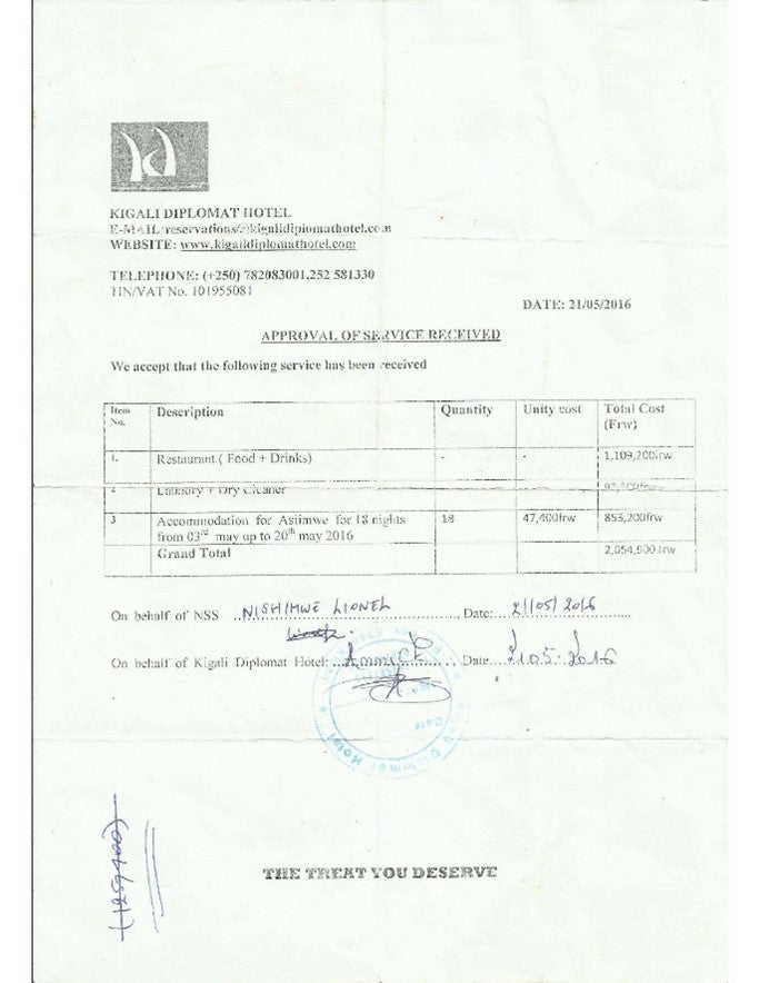 Invoice for Services Received at the Kigali Diplomat Hotel, May 21, 2016.