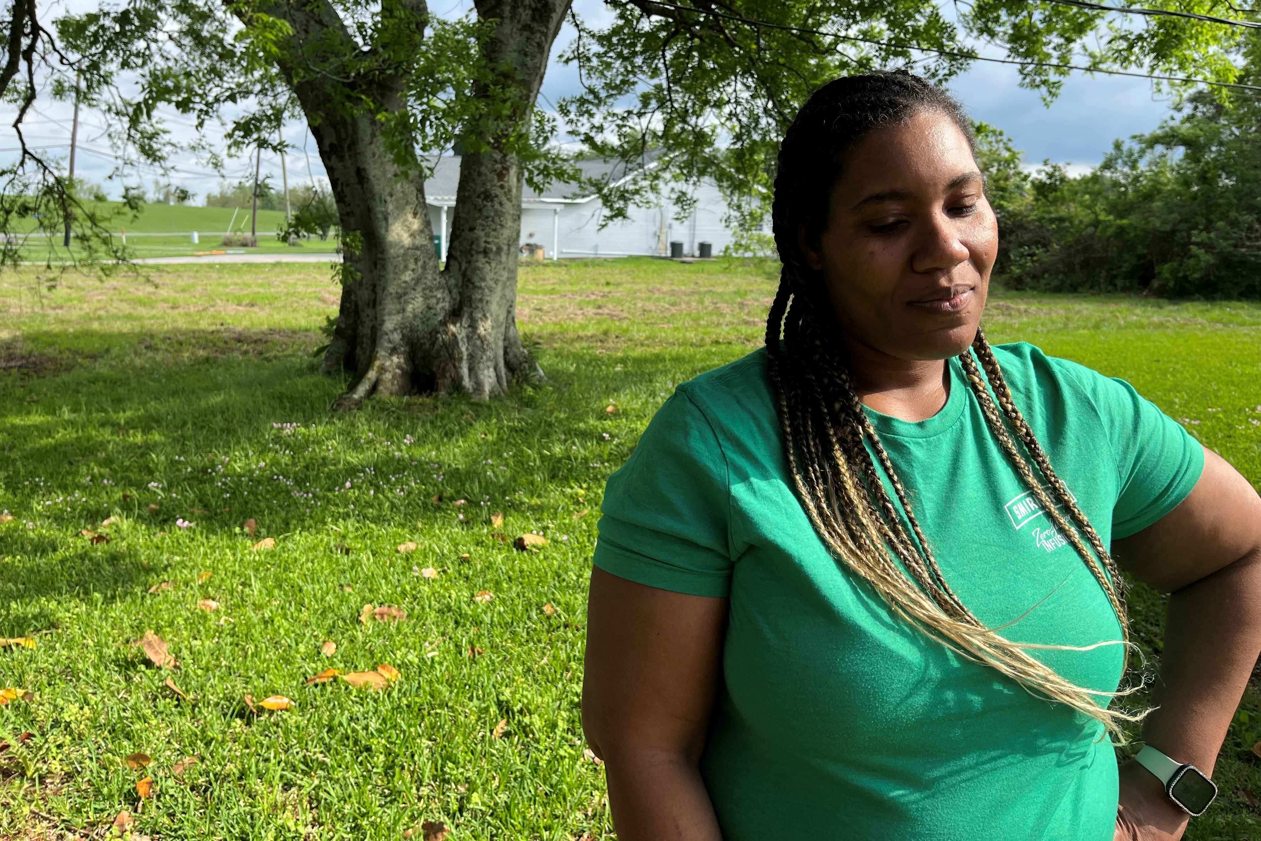 Chasity White outside of her home in St. James Parish. Both her children suffer from respiratory ailments. “I know it’s from the pollution in the air,” she said. “The pollution is killing us.” March 28, 2023.