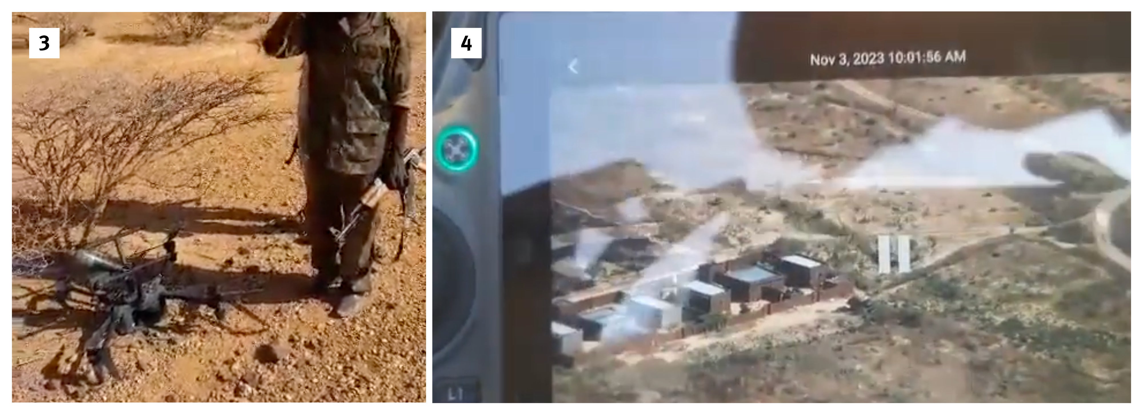 A video (3) posted by a pro-SAF account on June 9, 2024, shows members of the Joint Force— a coalition of Darfuri armed groups aligned with the SAF—around a damaged drone which they claim was used by the RSF in El Fasher, North Darfur.  The drone is identifiable as a DJI Matrice series from the shape of its main body, the inverted propellers, and its matte grey color.