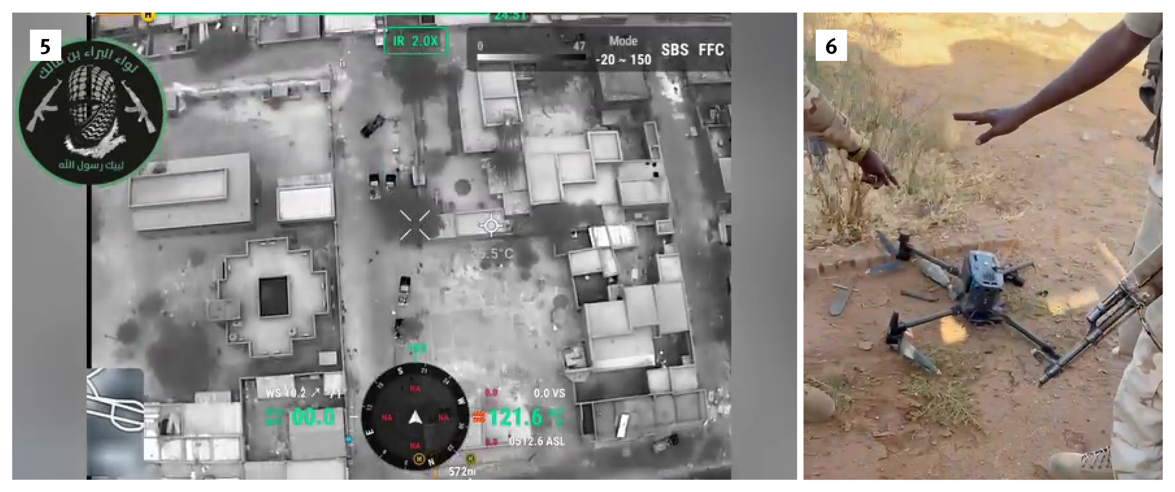 A pro-SAF Telegram account on April 8, 2024 posted a video containing several clips of footage filmed from drones (5), watermarked with the logo of the Bara’ al-Malik Brigade, an Islamist militia aligned with the SAF