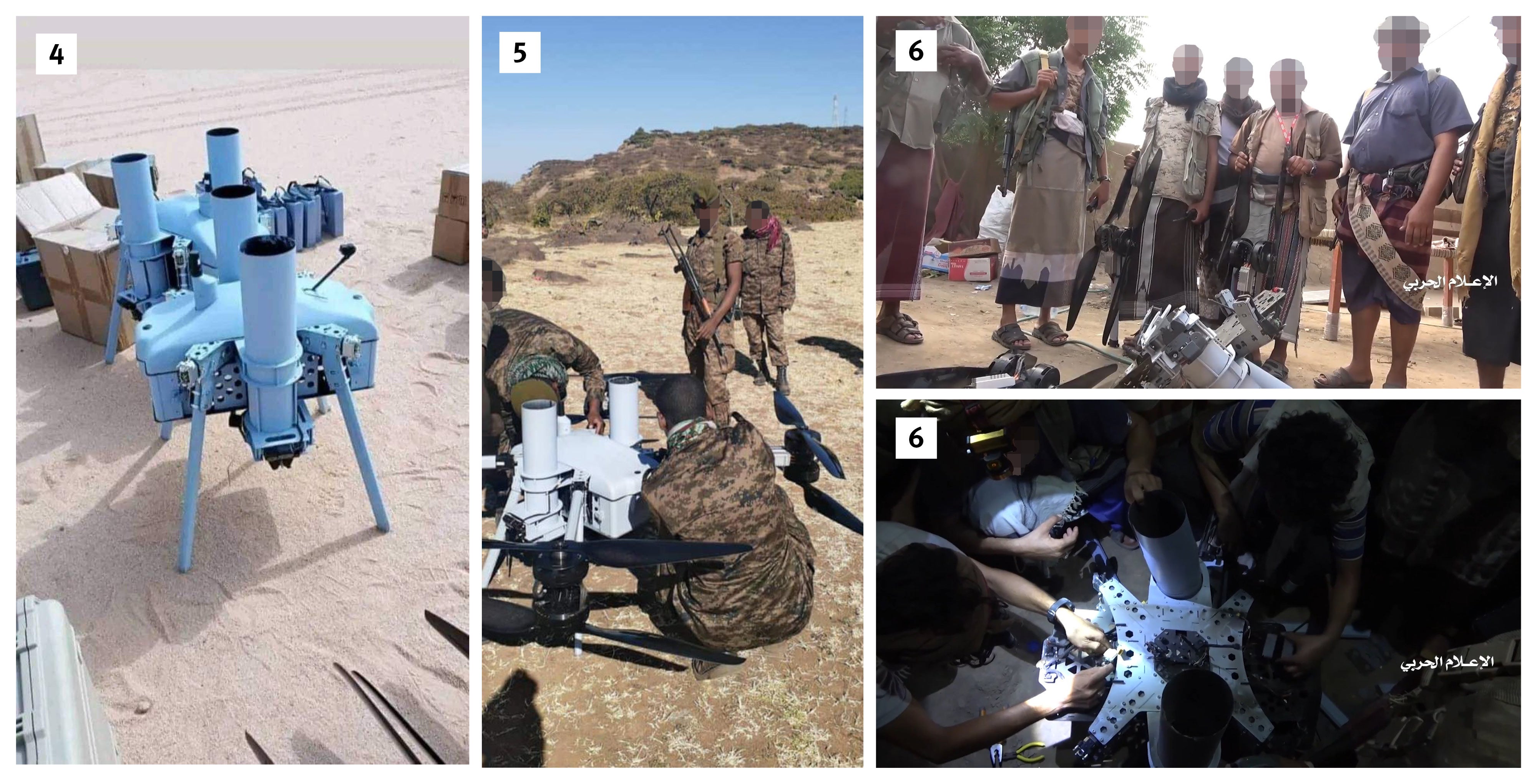 The drone appears to be a large drone retrofitted with two tubes designed to carry and drop the 120mm thermobaric munitions (4). Though the drone is manufactured according to a standardized design, it notably lacks visible markings, obscuring its origins. A nearly identical drone was used by the Ethiopian military in Ethiopia (5) and by an unknown force against Houthis in Yemen (6) in 2021.
