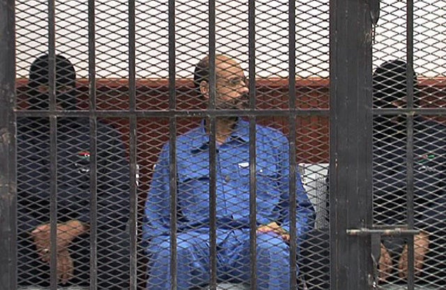 Saif al-Islam, son of deposed strongman Muammar Gaddafi, sits behind bars during a court session in Zintan, Libya on May 2, 2013.