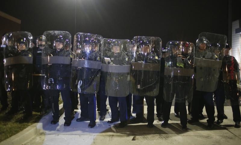 Missouri State Troopers in riot gear stand in formation outside the Ferguson Police Department in Ferguson, Missouri, November 24, 2014.