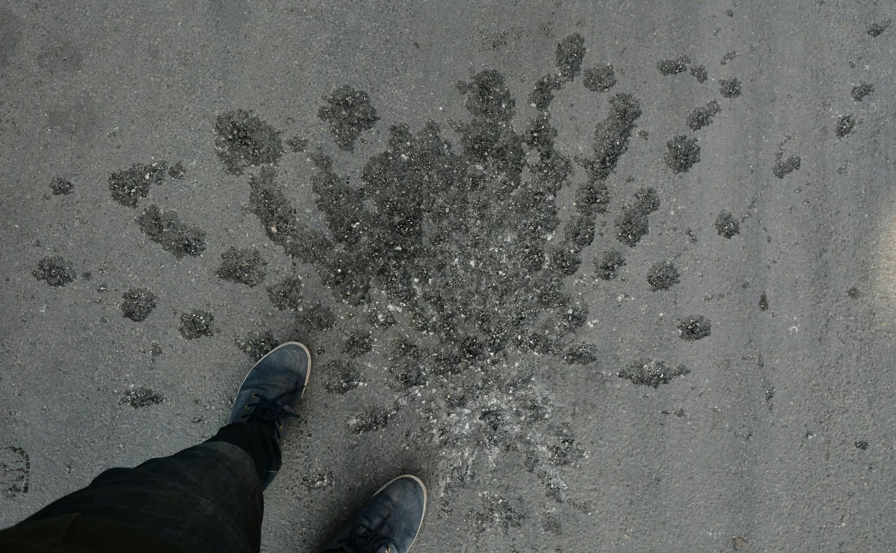 Fragment pattern typical of the detonation of a submunition seen in the asphalt in Douma, Damascus, after a cluster munition attack on February 3, 2016. © 2016 Firas Abdallah