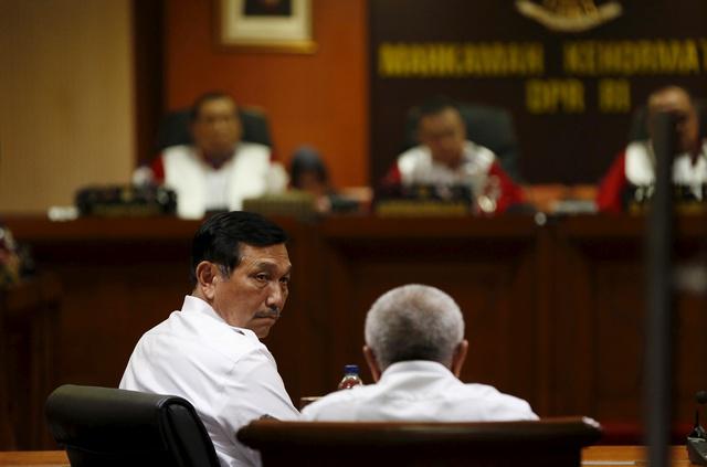 Luhut Pandjaitan (L), Indonesian chief security minister and key presidential adviser, attends a parliamentary ethics panel hearing in Jakarta, Indonesia on December 14, 2015.