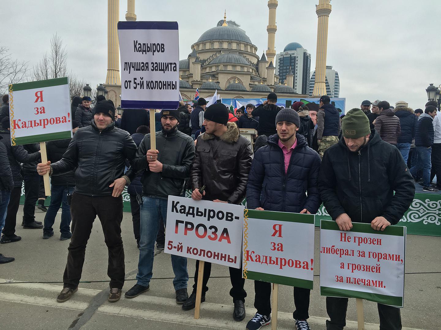 Men standing with signs “I’m for Kadyrov” and “Kadyrov is the Scourge of the Fifth Column” at a mass pro-Kadyrov rally organized by Chechen authorities in Grozny in January 2016.