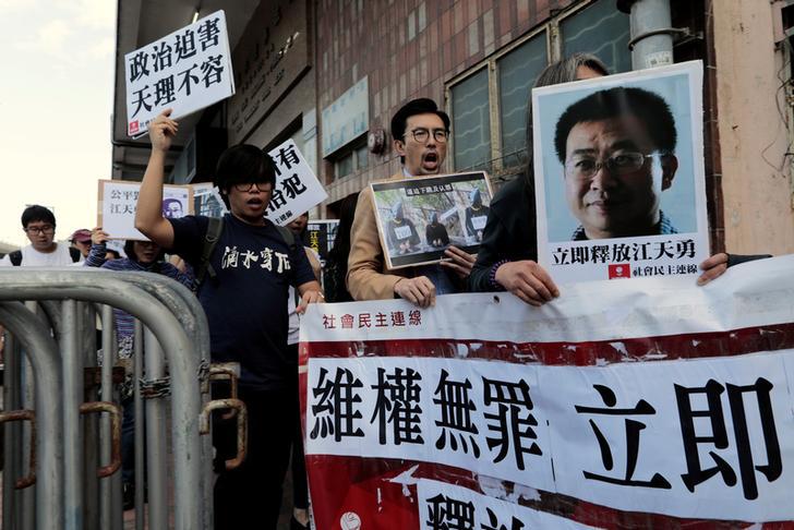 Pro-democracy demonstrators hold up portraits of Chinese disbarred lawyer Jiang Tianyong, demanding his release, during a demonstration outside the Chinese liaison office in Hong Kong, China December 23, 2016.