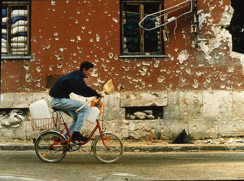 A boy going for water rushes across a dangerous intersection where some 20 people had, in recent weeks, been killed by snipers. Mostar was under siege and its residents were desperate for water. September 7, 1993.