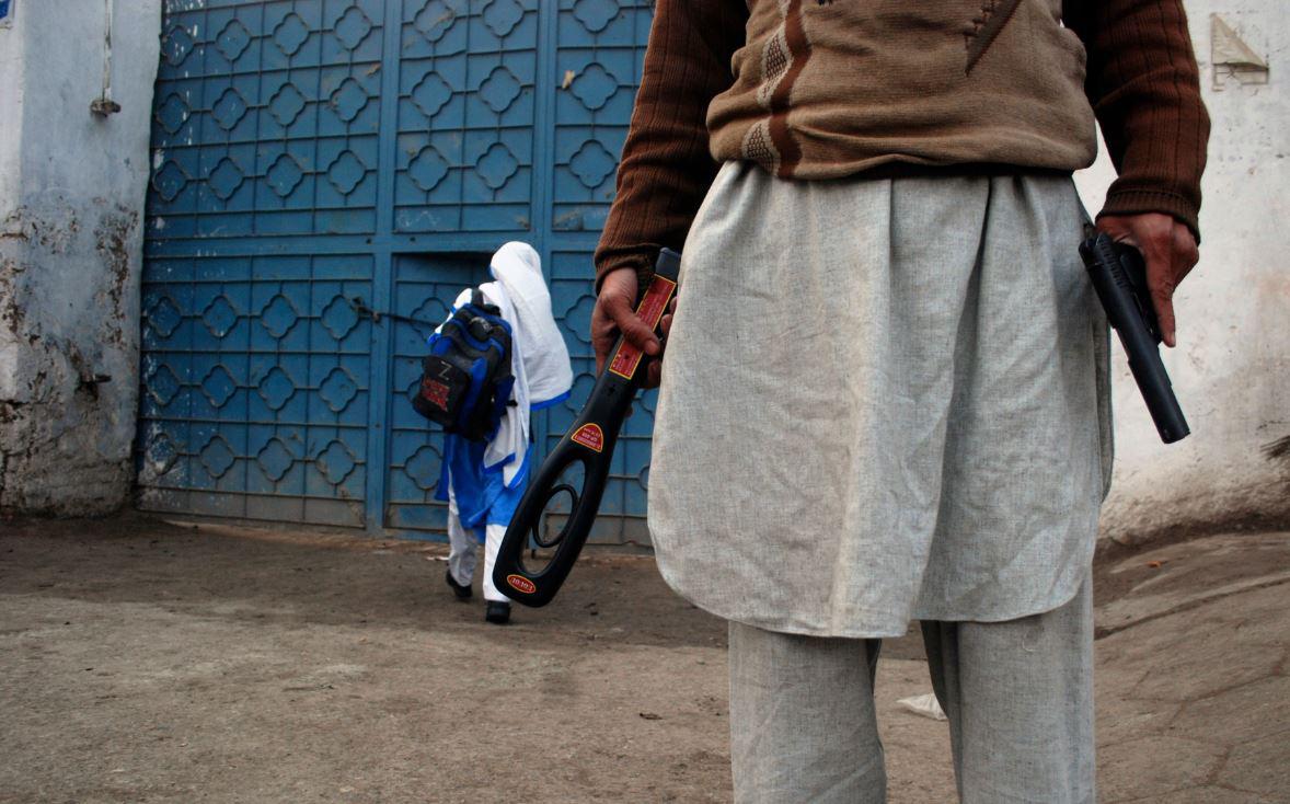 A man with a gun and a metal detector poses for photographers (unseen) while he stands outside a school after it reopened in Peshawar January 12, 2015.