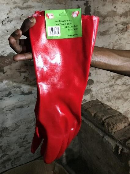 The gloves PHC distributes to workers who apply pesticides are 60 percent leather and 40 percent cloth; these materials absorb and hold the pesticide close to the skin. Yaligimba, February 1, 2019.