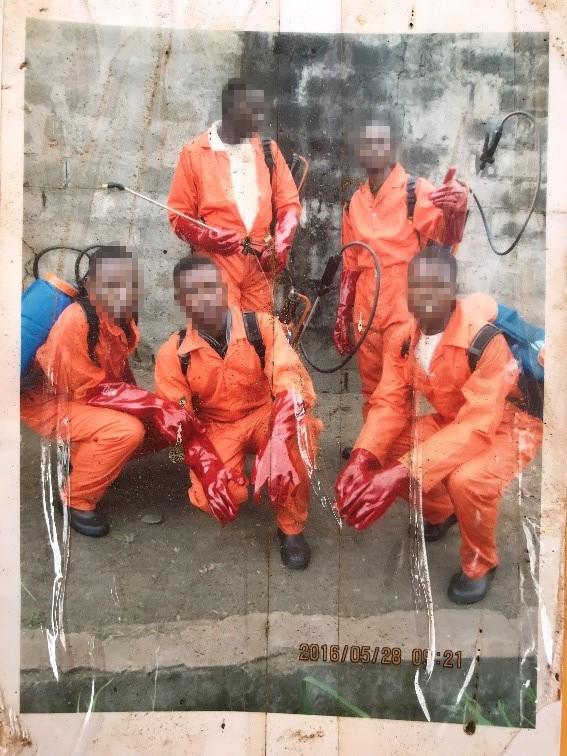 Workers who spray pesticides in Lokutu, wearing leather and cloth gloves and cotton overalls. Lokutu, May 28, 2016.