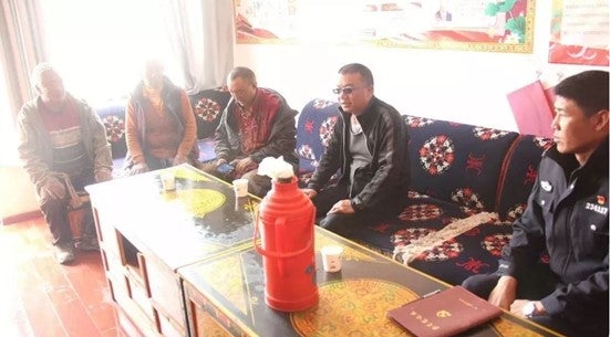 Tingri County Public Security chief Hu Jicheng meets Tengdro monks, in Tingri county, Tibet Autonomous Region, August 2018.