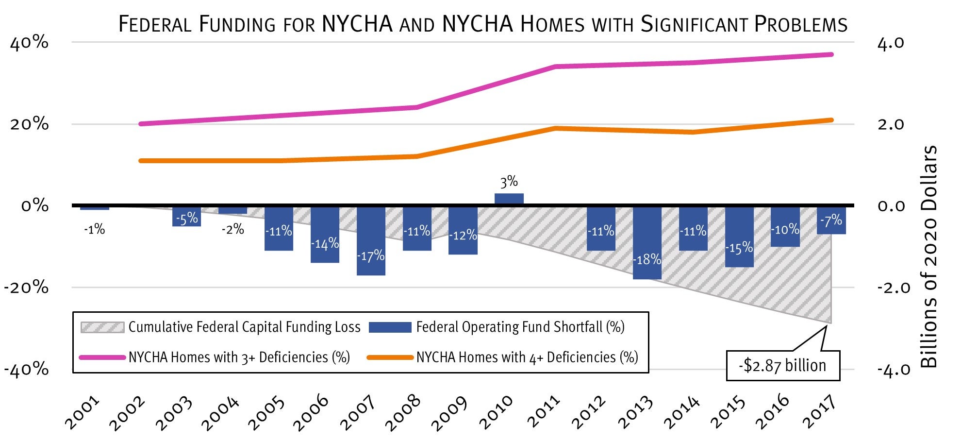 Source: HRW analysis. Funding data from NYCHA and HUD. Inflation adjustments made using Bureau of Labor Statistics CPI-U inflation calculator. Deficiency data from Community Service Society analysis of US Census Bureau data.