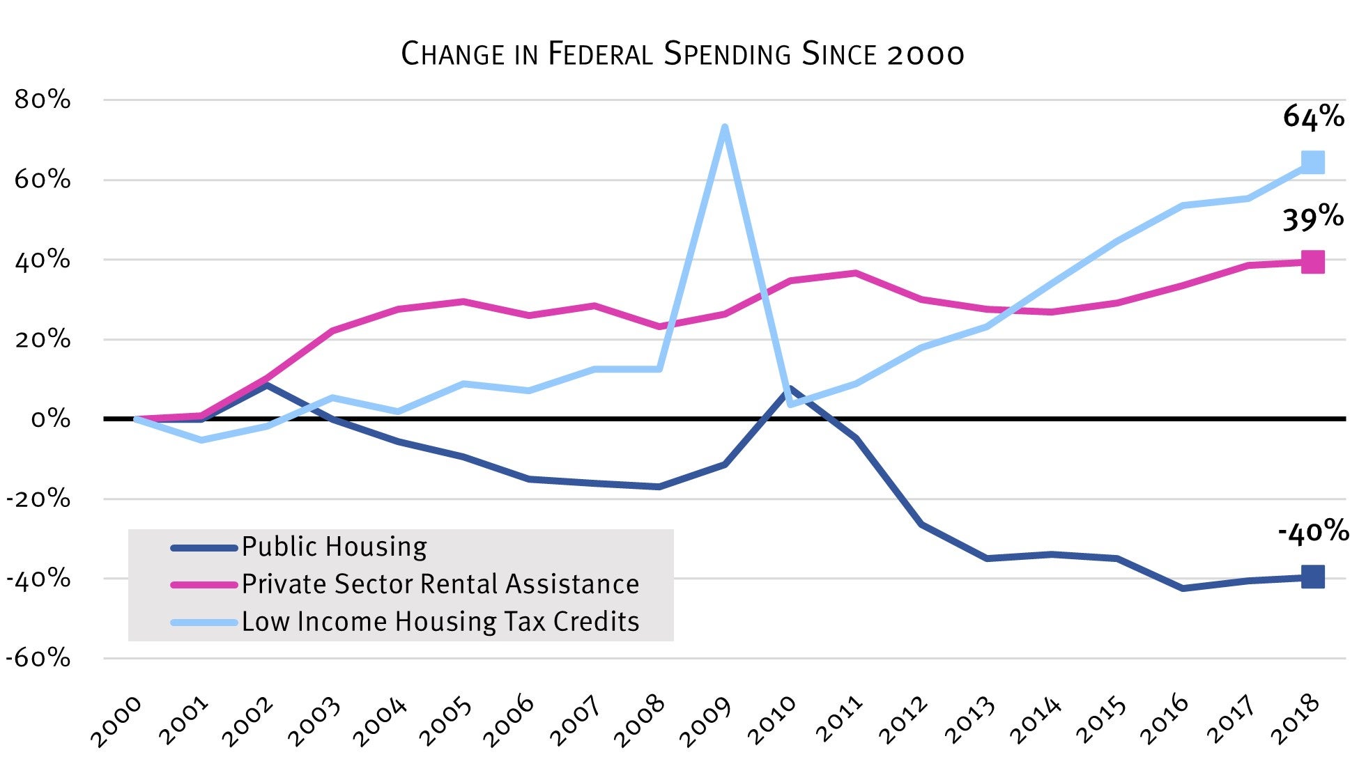 Note: Public housing funding includes funding for demolitions and programs such as HOPE VI, which lead to a decrease in public housing units. Private sector rental assistance includes both project and tenant-based Section 8 programs, as well as rural housing programs operated by the US Department of Agriculture.
