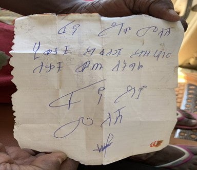 Threatening pamphlet reported to have been distributed in Baeker town around November – December 2020. Pamphlet loosely translates to: "Tigrayans leave this territory if you want [to save] your life," and is allegedly signed by Fano militias.
