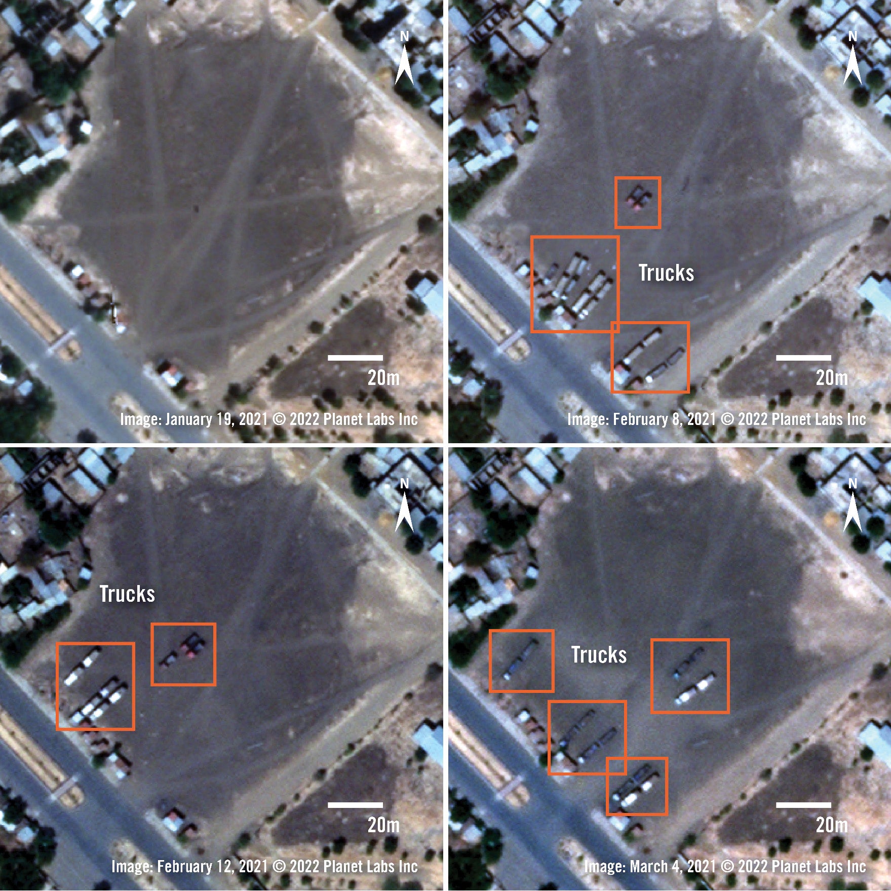 A time series of satellite imagery from January 19, 2021 to March 4, 2021, shows the movement of trucks in a lot across from the hospital in Humera coinciding with arrival of new residents in the town and the reported forcible displacement of Tigrayans from Humera. The lot is approximately 600 metres east of the bus station in town where vehicles gathered before November 2020. On January 19, no vehicles are visible in the lot. On February 8, many trucks are visible and the beds appear covered. On February 12, six trucks with covered beds are present along with three trucks without covered beds. On March 4, imagery shows trucks, many without covers on their beds.