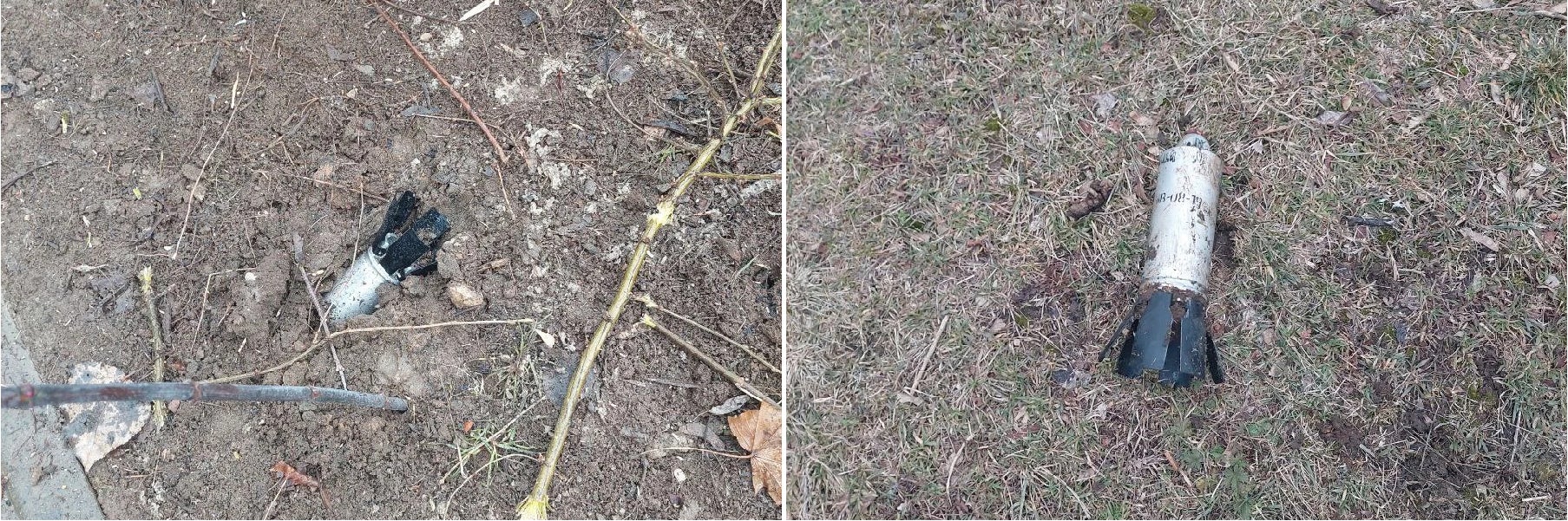 Unexploded 9N235 submunitions in Kharkiv after the February 28 attack. Each 9M55K Smerch cluster munition rocket carries a total of 72 of these submunitions.