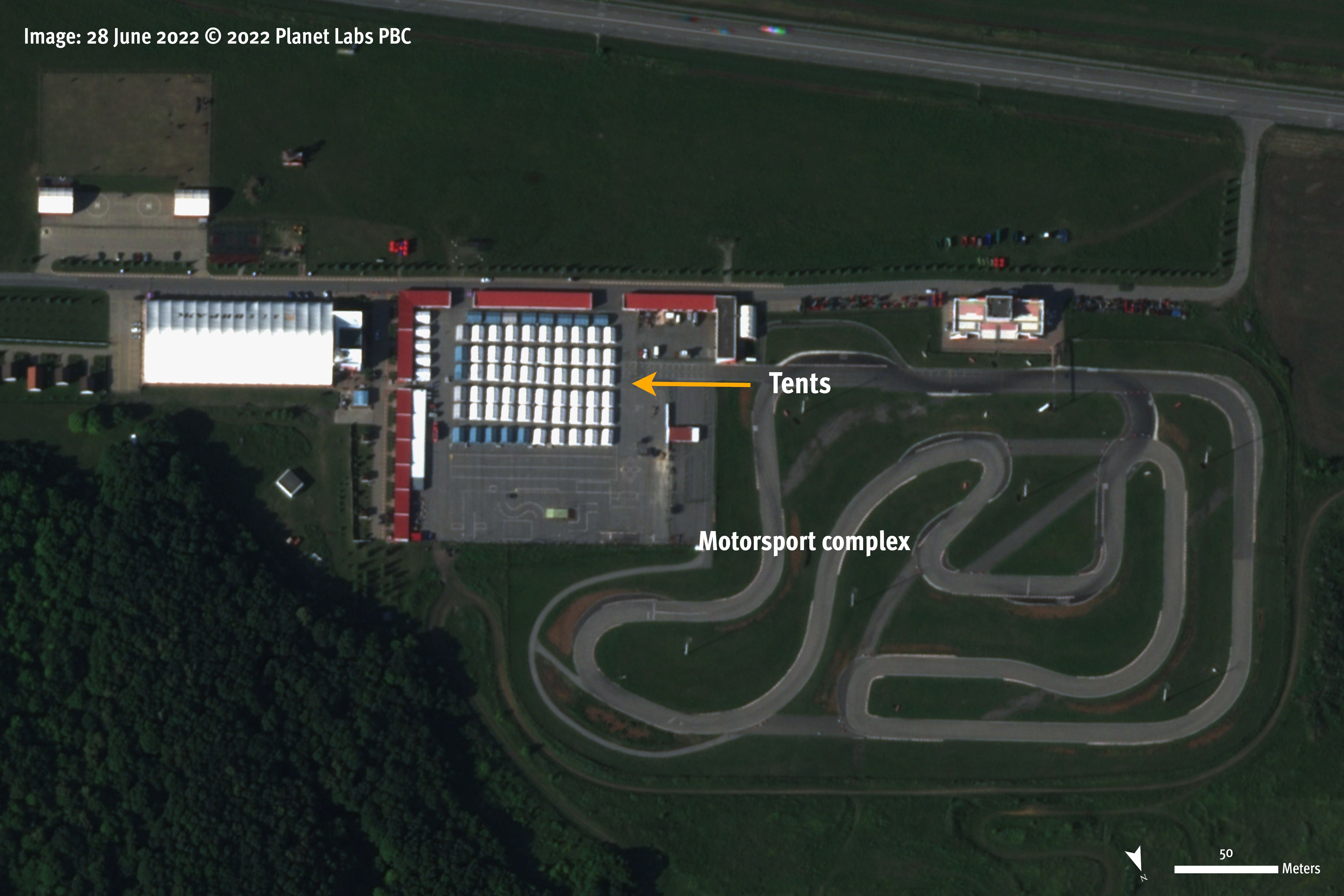 Satellite image recorded on June 28 shows at least 68 tents erected in the center of the parking lot of the Virage motorsport complex and five additional ones located on the side.