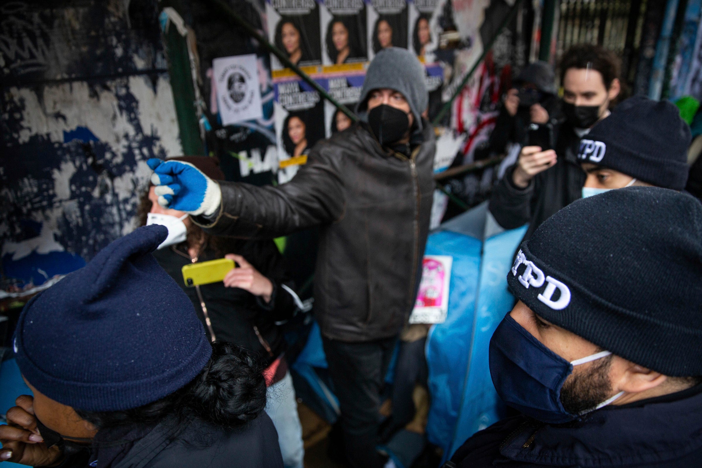 Residents of an unhoused encampment adjacent to Tompkins Square Park in New York City, NY are arrested on April 6, 2022.