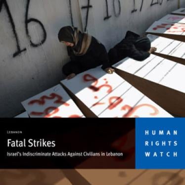 The 50-page report, “Fatal Strikes: Israel’s Indiscriminate Attacks Against Civilians in Lebanon,” analyzes almost two dozen cases of Israeli air and artillery attacks on civilian homes and vehicles. Of the 153 dead civilians named in the report, 63 are children. More than 500 people have been killed in Lebanon by Israeli fire since fighting began on July 12, most of them civilians.