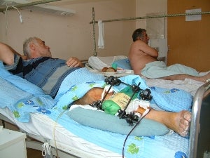 ![]() Nodar Mchedlishvili, 54, was wounded during an attack that took place in front of the Gori Municipality Administration Building the morning of August 12, 2008. He and other civilians had gathered there to receive food and other humanitarian assistance. © 2008 Human Rights Watch |