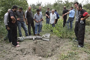 ![]() Georgians look at the remnants of an RBK-250 cluster bomb dropped by Russian aircraft on the village of Ruisi, near South Ossetia, Tuesday, Aug. 12, 2008. Human Rights Watch has identified the weapon as a RBK-250 cluster bomb. |