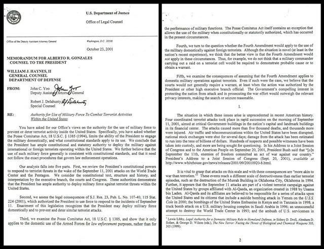 The memos were written by the Justice Department’s Office of Legal Counsel to provide the legal framework for the CIA’s use of “enhanced interrogation techniques” including “waterboarding,” which has been prosecuted as a war crime in the United States for more than 100 years.