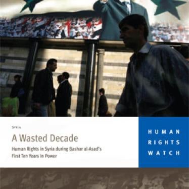 The 35-page report, "A Wasted Decade: Human Rights in Syria during Bashar al-Asad's First Ten Years in Power," reviews al-Asad's human rights record in five key areas: repression of political and human rights activism; restrictions on freedom of expression; torture; treatment of the Kurds; and Syria's legacy of enforced disappearances. The verdict is bleak.