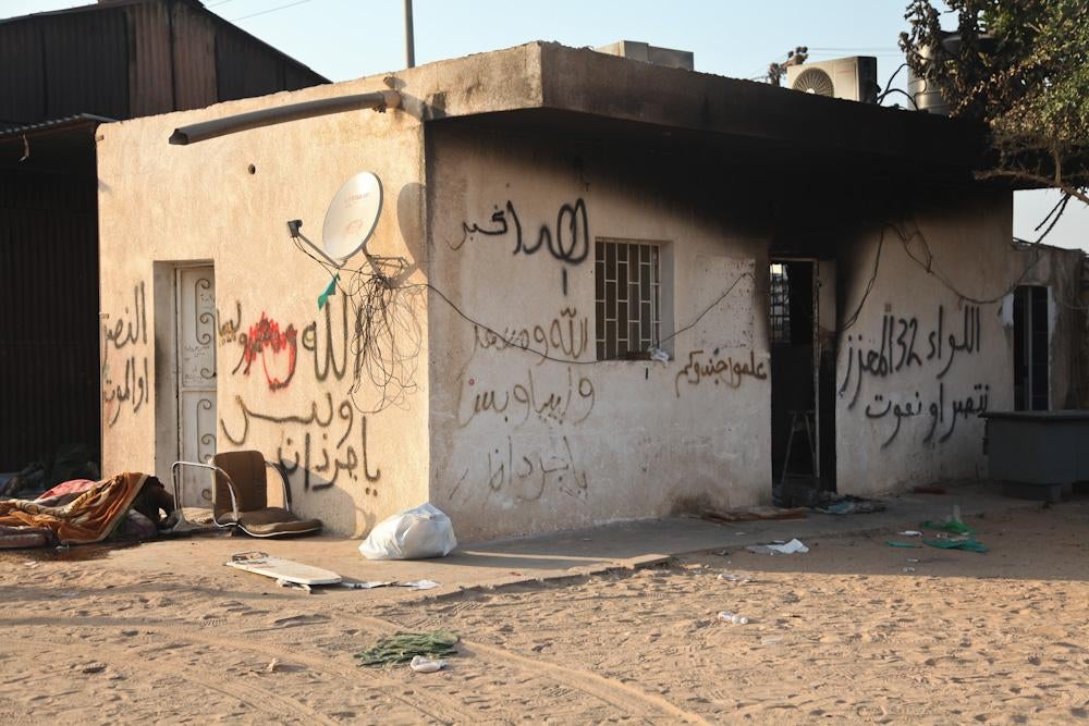 Human Rights Watch interviewed a survivor who said that guards at the warehouse, used as a prison, read out 153 names of detainees in the roll call the day of the killings. He estimated that 20 escaped from the attack and said that around 125 of the 153 detainees were civilians. Human Rights Watch observed that one building in the compound had spray-painted on it “32nd Brigade,” which is the official name of the Khamis Brigades.