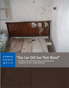 The 105-page report, “‘You Can Still See Their Blood’: Executions, Indiscriminate Shootings, and Hostage Taking by Opposition Forces in Latakia Countryside,” presents evidence that the civilians were killed on August 4, the first day of the operation. Two opposition groups that took part in the offensive, the Islamic State of Iraq and Sham and Jaish al-Muhajireen wal-Ansar, are still holding the hostages, the vast majority women and children. The findings strongly suggest that the killings, hostage taking, and other abuses rise to the level of war crimes and crimes against humanity, Human Rights Watch said.