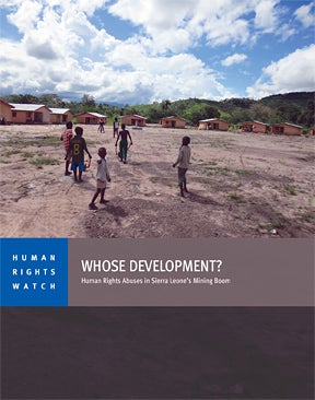 The 96-page report, “Whose Development?: Human Rights Abuses in Sierra Leone’s Mining Boom,” documents how the government and London-based African Minerals Limited forcibly relocated hundreds of families from verdant slopes to a flat, arid area in Tonkolili District. As a result, residents lost their ability to cultivate crops and engage in income generating activities that once sustained them. Police carried out a bloody crackdown in the town of Bumbuna in April 2012 to quell a protest by workers who went on strike after being barred from forming a union of their own choosing.
