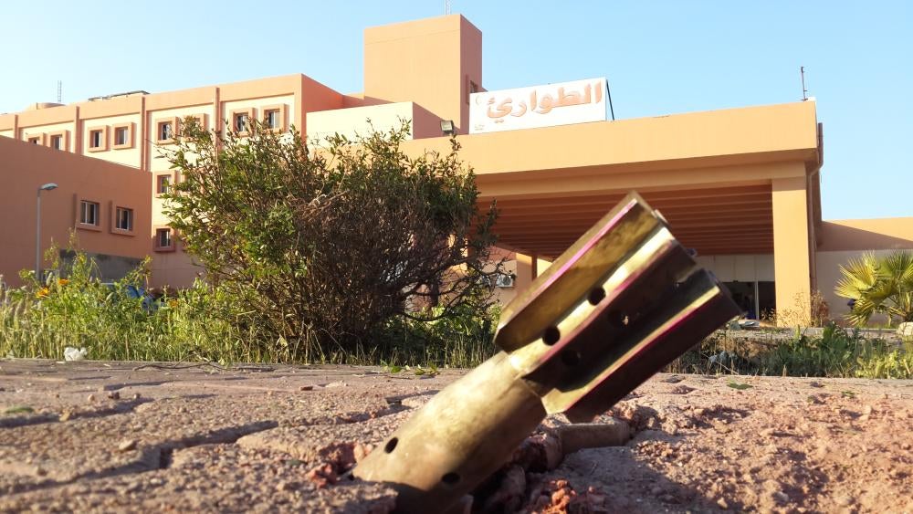 In late January or early February, another mortar shell landed in the street outside the hospital’s main gate, Abu Ahmed said. He said he was in the hospital visiting his brother, who works there, and saw the shell hit. Abu Ahmed said he did not see any armed fighters in or around the hospital during on either date.
