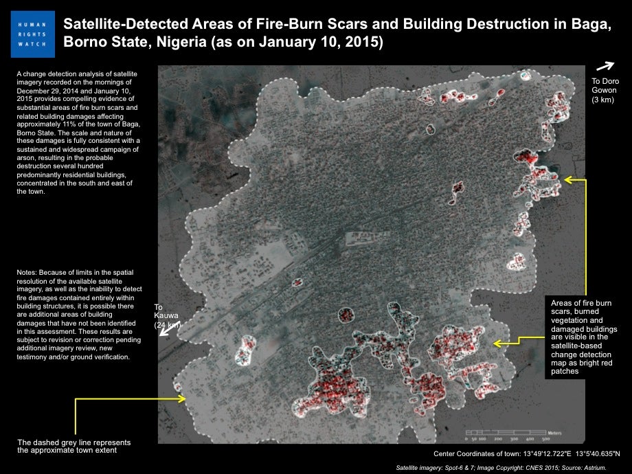 After the 2013 assault, we gathered information and analyzed satellite imagery, which conclusively showed that the soldiers destroyed a total of 2,275 buildings and severely damaged another 125. A preliminary report on the incident by the Nigeria National Human Rights Commission (NHRC), quoting a police report and witness accounts to NHRC staff, confirmed Human Rights Watch’s information and analysis.