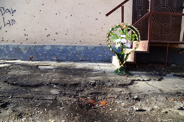 A submunition impact crater and fragmentation damage on the wall where two people died in Kramatorsk during an attack with cluster munitions on February 10. © 2015 Human Rights Watch