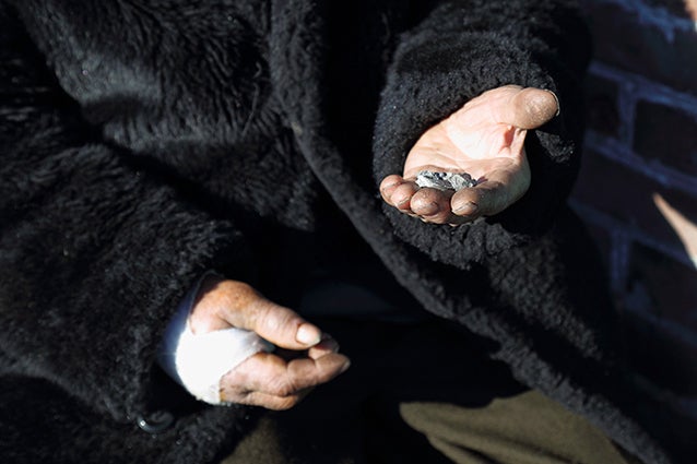 Ivan Fedorovich, 83, holds fragments that wounded him in his hand and stomach during a cluster munition attack on Hrodivka on February 10. © 2015 Human Rights Watch