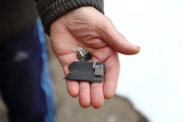 Fragments and remnants of a submunition's stabilization fins found after a cluster munition attack on Luhansk city on February 12. © 2015 Human Rights Watch