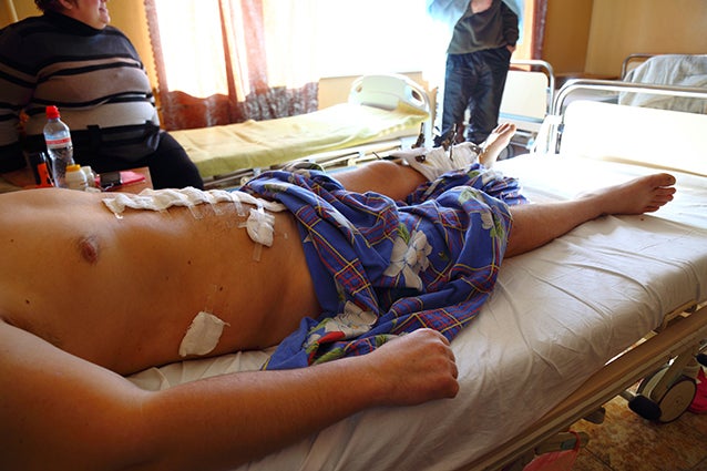 Sergey, 45, who was injured during a cluster munition attack on Luhansk on January 27. © 2015 Human Rights Watch