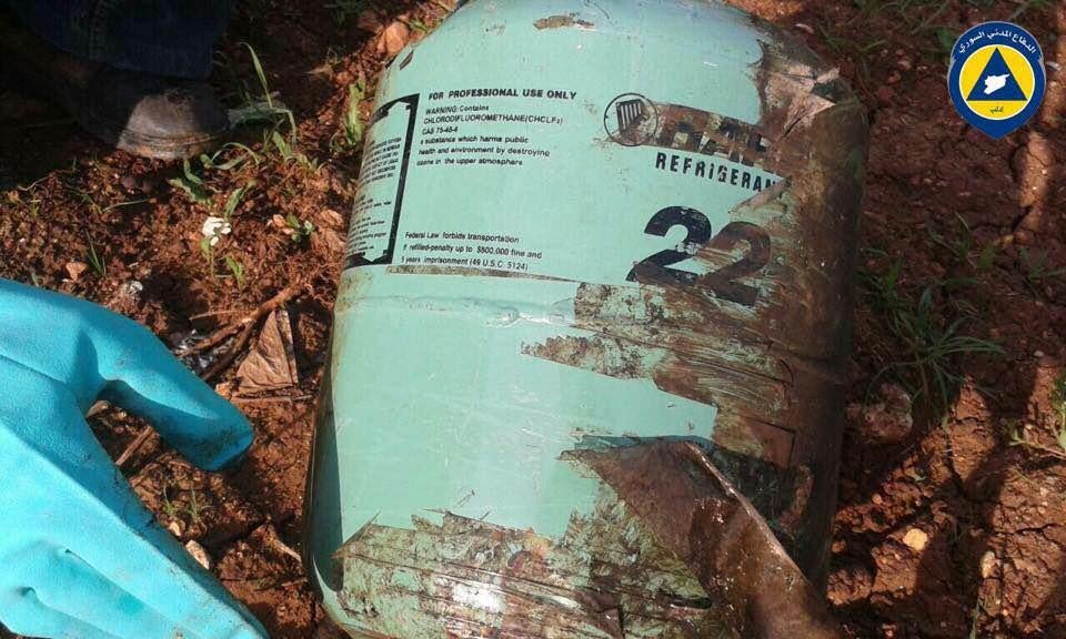Among the remnants, witnesses reported finding containers typically used for refrigerants in refrigerators and air-conditioners. Videos and photos from the aftermath of five attacks, including material shared by the Syrian Civil Defence, show containers of a size, shape, and design commonly used for refrigerants. These canisters are easy to refill with other gases and widely available in Syria.