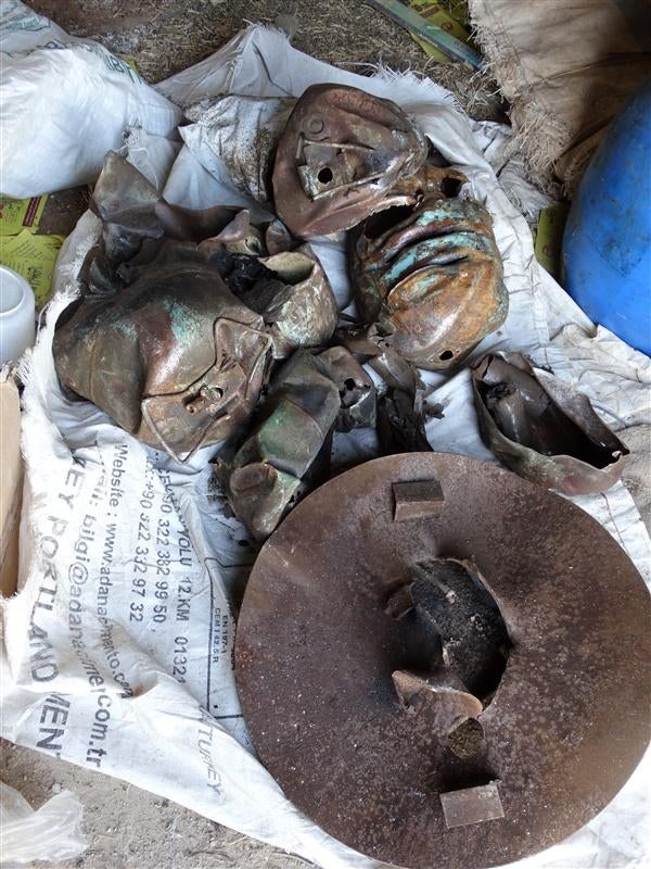 Rescue workers and activists who examined both the Qmenas and Sarmin impact sites the next day told Human Rights Watch that at each site they found barrel bomb remnants, including several gas canisters normally used for storing refrigerants for refrigerators and air conditioners. One rescue worker told Human Rights Watch that he saw yellow residue on one of the canisters at the Qmenas impact site. Fares sent Human Rights Watch a photo that he took at one of the sites showing what appear to be deformed gas canisters. A video that the Sarmin Coordination Council posted on March 17 shows remnants of the barrel bomb and several erupted refrigerant gas canisters.