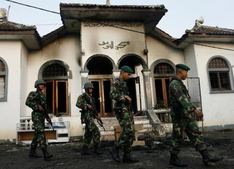 Soldiers walk past a burnt mosque owned by followers of the minority Islamic sect, Ahmadiyah, in Ciampea, a village in Indonesia's West Java province October 2, 2010. © 2010 Reuters