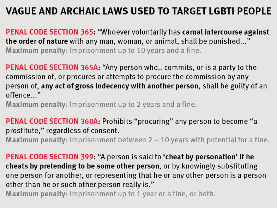 Consensual same-sex conduct is criminalized under sections 365 and 365A of the penal code. Other laws, including a vaguely worded Vagrancy Law and a law against “cheating by personation,” are also used to target gender non-conforming and other LGBTI people for arrest. Some transgender women and men who have sex with men said that repeated harassment by police, including arbitrary detention and mistreatment, had eroded their trust in Sri Lankan authorities, and made it unlikely that they would report a crime.