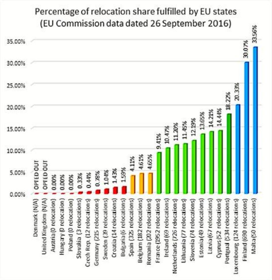 France has relocated the largest number - 1,987 - over a third of the total. Finland, Portugal, the Netherlands and even Malta, Cyprus, and Luxembourg, the EU’s smallest countries, have made progress toward fulfilling their commitments.