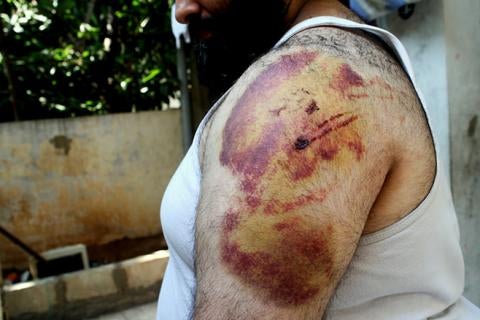 One detainee said that during his interrogation at the Ministry of Defense, officers slapped him, punched him in the face, and threw him against the wall. He said that the beatings left him with a swollen neck, back, and legs, and with bruises all over his body. He said officers made him stand in front of the wall in the interrogation room for five hours until he passed out and collapsed. The next day he was forced to sign a piece of paper that he was not allowed to read.