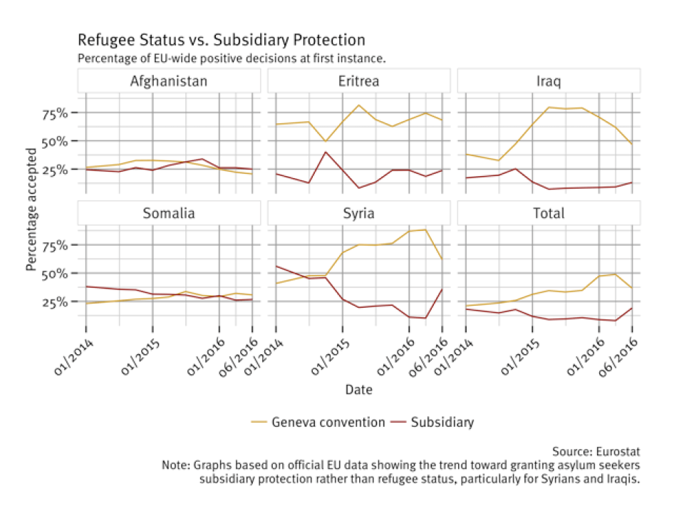 Overall EU statistics for protection rates at first instance for five top asylum seeking nationalities—Syrians, Afghans, Iraqis, Eritreans, and Somalis—demonstrate a trend towards granting subsidiary protection over refugee status, notably in the first six months of 2016. This trend is particularly marked for Syrians.