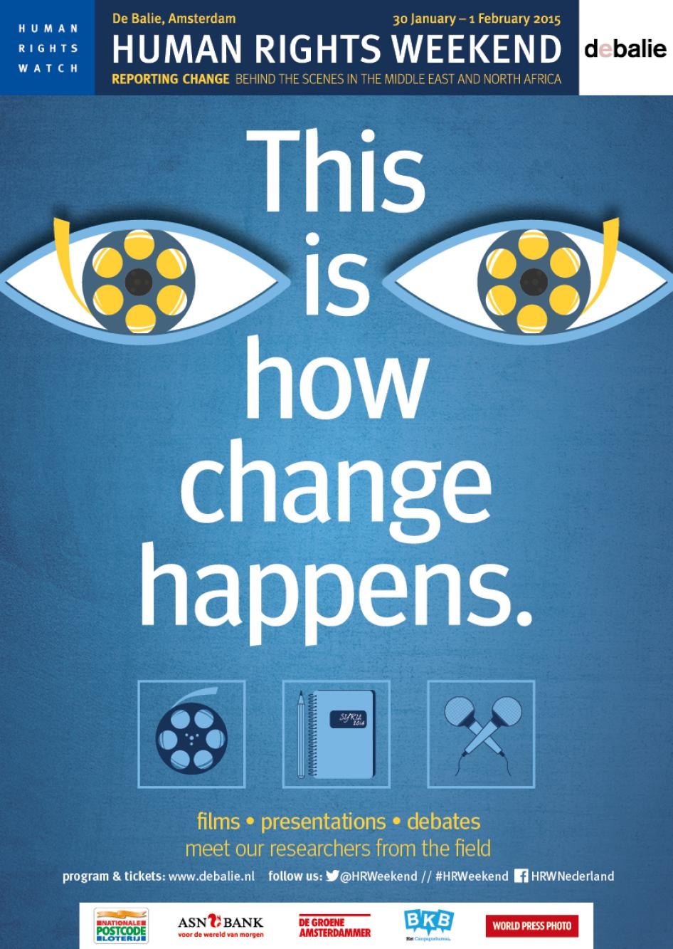Partners for the Human Rights Weekend are: De Balie, ASN Bank, PAX, Dutch Postcode Lottery, De Groene Amsterdammer, VICE, NIOD and vfonds.