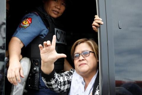 De Lima’s arrest followed a months-long government campaign of harassment and intimidation against her. That campaign was in response to her demands for accountability for the more than 7,000 Filipinos killed by police and unidentified “vigilantes.” Human Rights Watch research has subsequently determined that many of the 3,271 death-squad-style extrajudicial killings the police attribute to “vigilantes” and drug gangs are a veneer to shield themselves and police agents from culpability in death-squad-style extrajudicial executions. If convicted, de Lima faces from 12 years to life in prison.