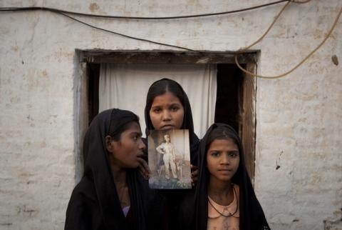 The daughters of Aasia Bibi pose with an image of their mother outside their residence in Sheikhupura in Punjab Province, Pakistan on November 13, 2010. © 2010 Reuters